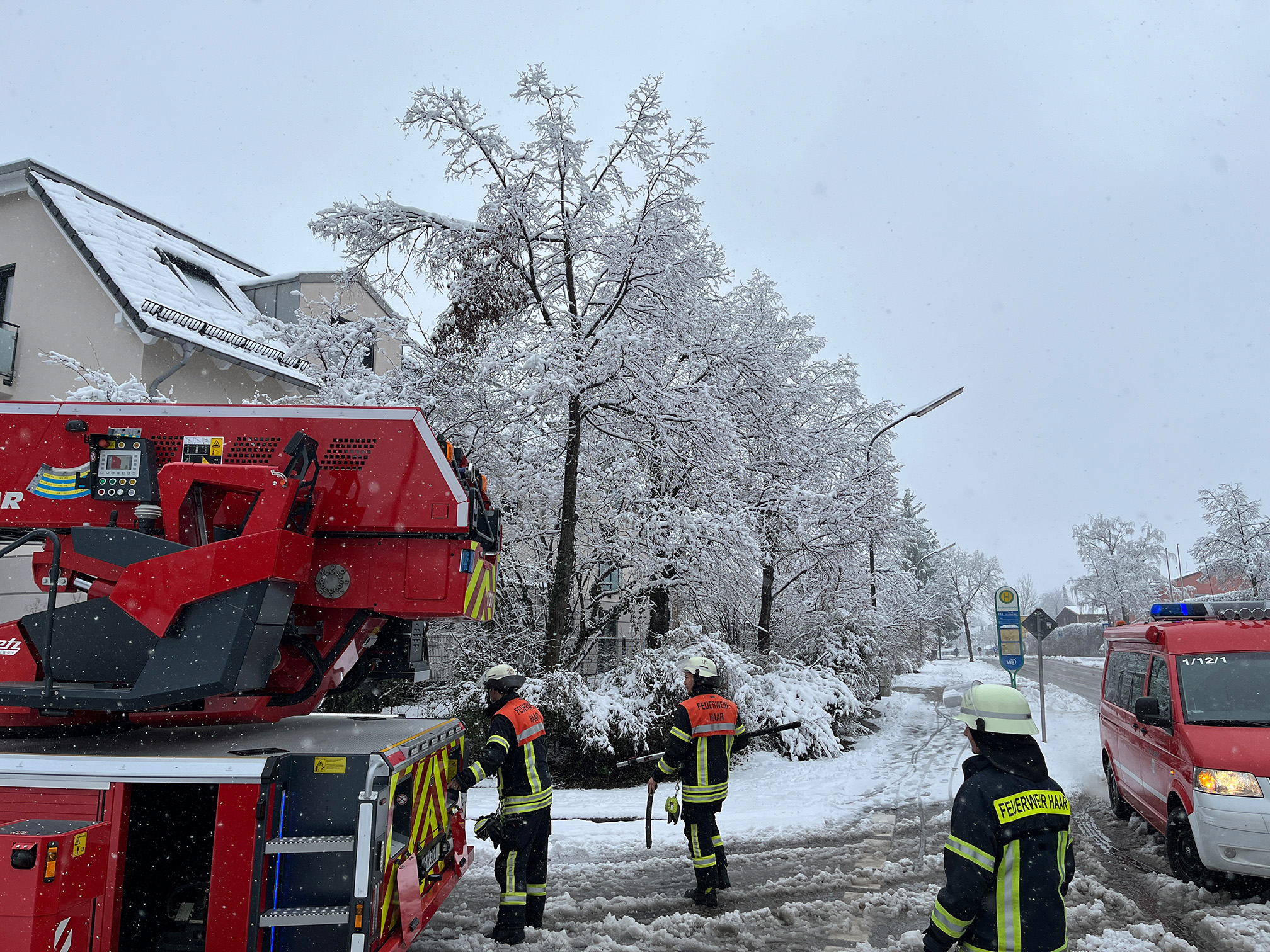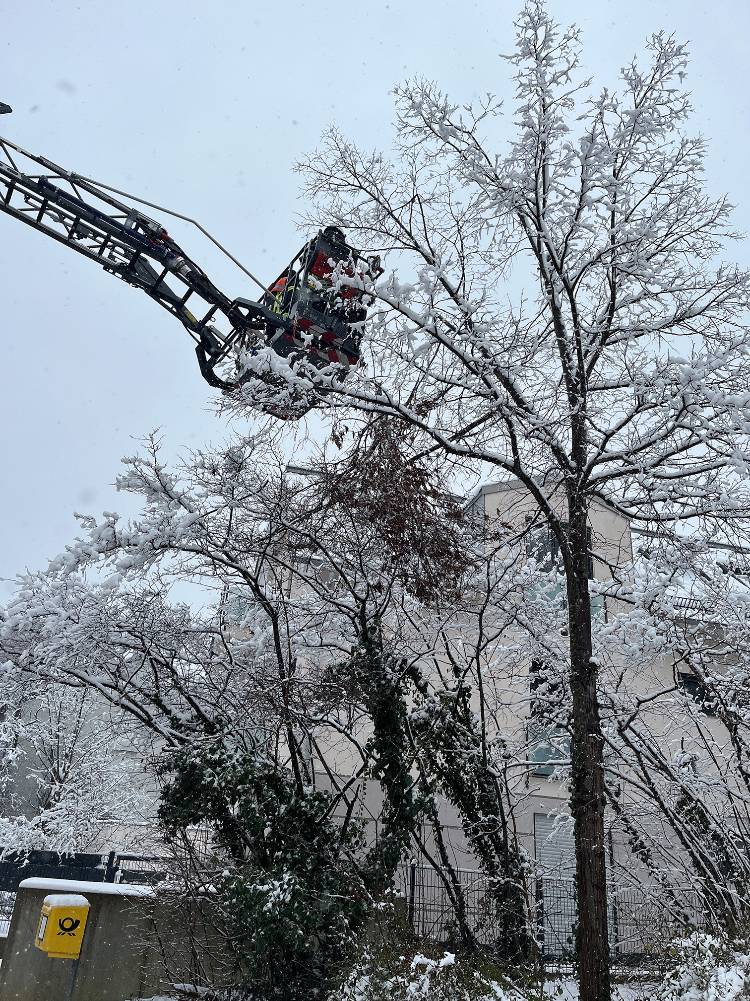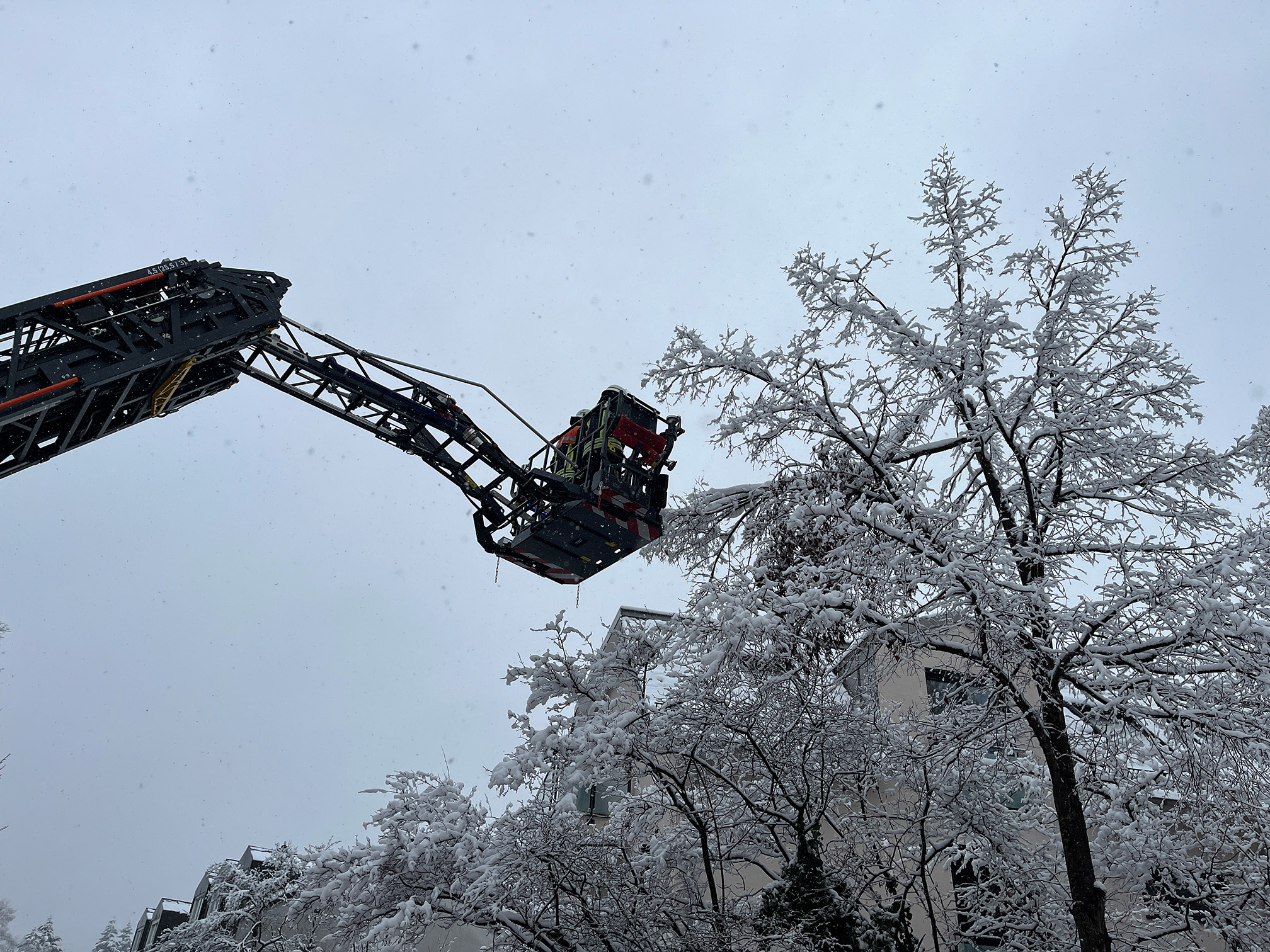 Der schwere Schnee führte bei einem Baum zu Schneebruch mehrerer Äste. Über die Drehleiter entferte die Feuerwehr Haar die Äste, bevor sie auf den darunter verlaufenden Gehweg fallen konnten.