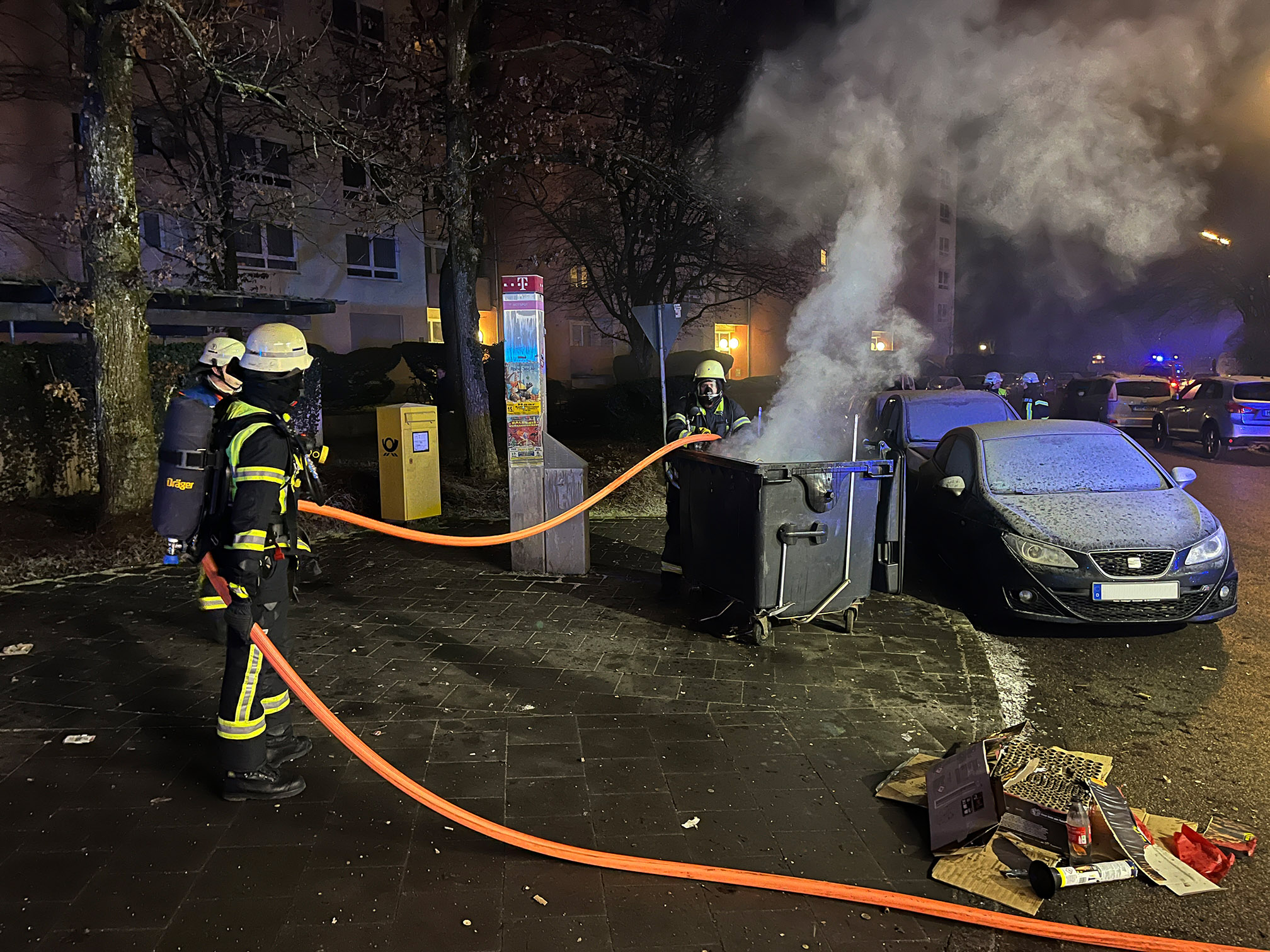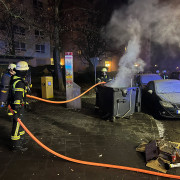 Die Reste eines Feuerwerks hatten eine Großraummülltonne in einem Müllhäuschen in Brand gesteckt. Die Einsatzkräfte der Feuerwehr Haar verbrachten die Tonne ins Freie, um sie dort mit dem Schnellangriff ablöschen zu können. Nach der Kontrolle mit der Wärmebildkamera schoben die Einsatzkräfte die Tonne wieder ins Müllhäuschen und rückten direkt zur nächsten Einsatzstelle ab.