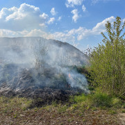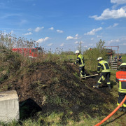 Hinter dem Kieswerk war eine Fläche von ca. 40m² in Brand geraten. Ein Trupp unter Atemschutz löschte den Brand rasch ab, zur Sicherheit kam auch der Dachmonitor zum Einsatz, um den Bereich großflächig mit Wasser zu durchnässen. Nach der Kontrolle mit der Wärmebildkamera konnte die Feuerwehr die Einsatzstelle an die Polizei übergeben.