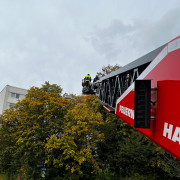 Die Feuerwehr Haar wurde zu einer Katzenrettung in die Ludwig-Thoma-Straße alarmiert.Die Katze entzog sich allerdings auch bei diesem Versuch den Rettungsmaßnahmen und flüchete auf einen Baum. der von der Leiter nicht mehr erreichbar war.