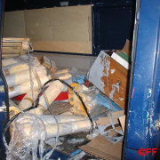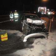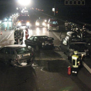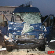 Am Freitag, den 05.05.2006, wurde die Feuerwehr Haar gegen 02:18 Uhr zu einem schweren Verkehrsunfall auf der A99 in Höhe der Ausfahrt Hohenbrunn alarmiert.Beim Ausrücken wurde zusätzlich die Feuerwehr Vaterstetten verständigt, da ein Teil der Fahrzeuge der Feuerwehr Haar seit Stunden bei einem Großbrand in Kirchstockach im Einsatz befanden. Beim Eintreffen der ersten Fahrzeuge bot sich den Einsatzkräften folgendes Bild: Ein Sattelzug war mit hoher Geschwindigkeit in eine Baustellenabsperrung der Autobahnmeisterei auf einen Sicherungsanhänger aufgefahren, schob diesen vor sich her und auf einen zweiten Sicherungsanhänger, der noch an einem Zugfahrzeug angekuppelt war.Das besagte Blechknäuel rutschte über die Böschung und schob sich ca. 20 Meter in das angrenzende Dickicht. Dort angekommen konnte der italienische Lenker sich zunächst selbst über die Dachlucke in Sicherheit bringen, von wo er dann mit der Drehleiter gerettet werden konnte. Nachdem der Brandschutz sichergestellt war mussten in Zusammenarbeit mit der Feuerwehr Vaterstetten zunächst 8 Bäume und zahlreiches Dickicht mit Motorsägen entfernt werden. Aus dem beschädigten Fahrzeugtank sickerte Dieselkraftstoff auf das Erdreich und die Ladung, 20 t Marmelade in Großfässern zu je einer Tonne, lagen, durch die Wucht des Aufpralls durch die Seitenwand auf die Böschung geschleudert, bis zu 100 m weit verteilt. Zur Bergung der Ladung war eine Zeitweise Totalsperrung der A99 notwendig. Nach Beendigung der notwendigen Aufräumarbeiten und der Inaugenscheinnahme durch das zuständige Wasserwirtschaftsamt konnte die Autobahn am Morgen wieder freigegeben werden.